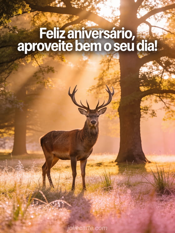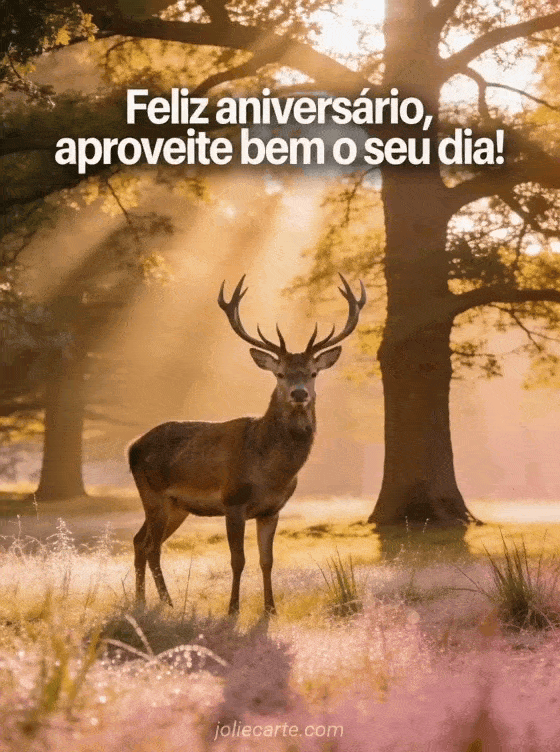 Envie este magnífico gif de aniversário com um majestoso cervo de imponentes chifres numa clareira coberta de orvalho ao nascer do sol, com raios de luz filtrando entre as árvores. Um cartão fotorrealista de aniversário com uma atmosfera serena e majestosa. Descubra também cartão aniversário homem carro esportivo ou votos de aniversário para homem.
