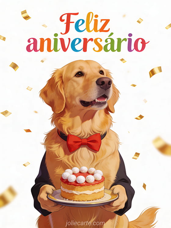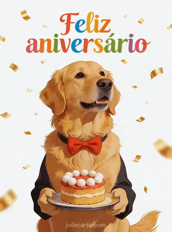 Envie este alegre gif de aniversário com um adorável cachorro golden retriever com gravata borboleta vermelha carregando um bolo decorado, com confetes dourados em estilo ilustrado. Um cartão gratuito para alegrar o dia dela. Descubra também gif de feliz aniversário para mulher ou gifs animados de aniversário para mulher.