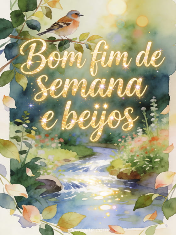 Compartilhe uma mensagem leve de fim de semana com letras em aquarela, luz dourada de jardim e beijos carinhosos. Veja também imagens de beijos bom fim de semana, bom fim de semana primavera ou bom fim de semana beijos animados.
