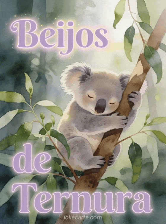 Envie um doce cartão de beijos de ternura para alguém querido. Um adorável coala se agarra a um galho de eucalipto com uma expressão sonolenta e terna, cercado de folhas verdes sob uma luz suave filtrada. Descubra também um cartão de super beijos ou um cartão de abraços e beijos.