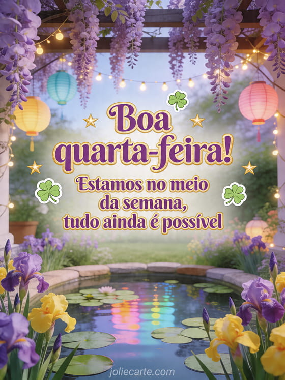 Compartilhe uma alegre mensagem de quarta-feira com um lago de jardim, íris floridas e glicínias em cascata. Veja também bom dia quarta-feira imagem, texto boa quarta-feira e boa quarta-feira imagens gratuitas.