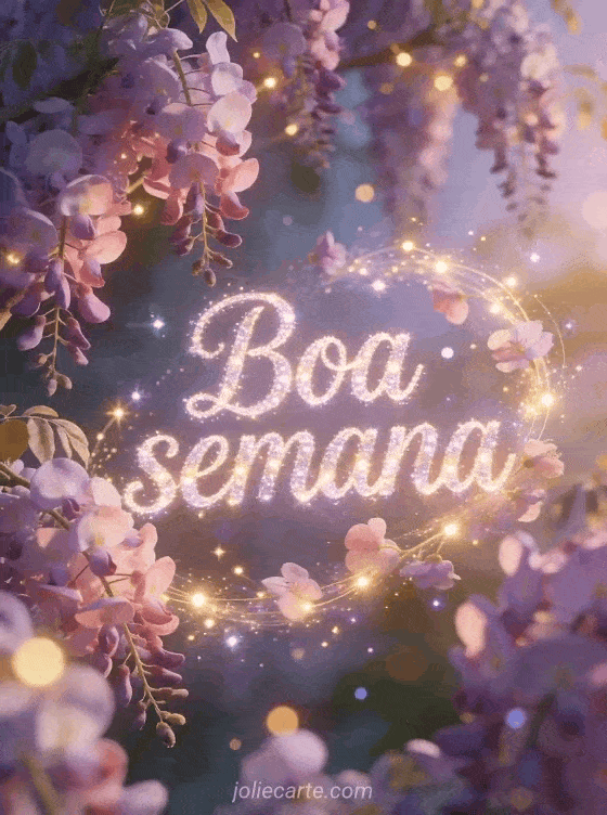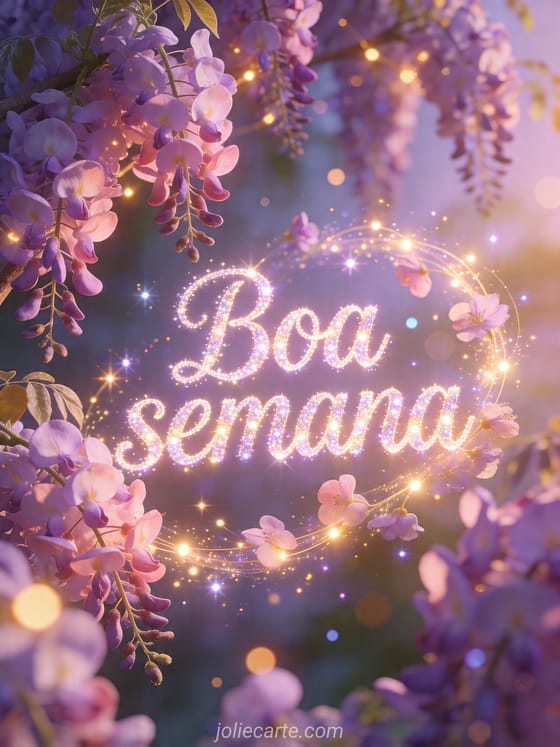 Compartilhe este lindo cartão de boa semana com brilhos mágicos, luzes encantadas e glicínias floridas. Você também pode descobrir boa semana imagem grátis, bom dia boa semana gif animado e bom dia amigos e boa semana.