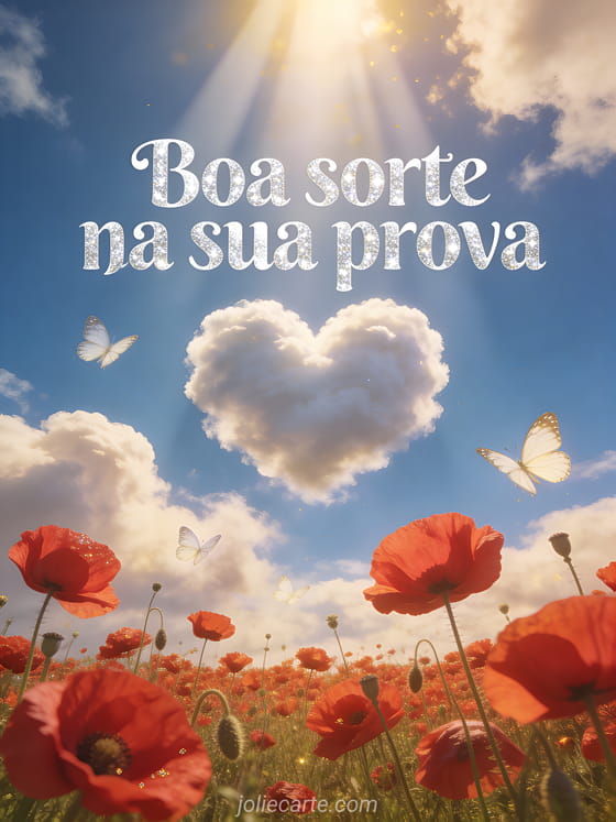 Envie uma mensagem calorosa e motivadora para quem está se preparando para uma prova com este lindo cartão com um céu azul, nuvens em forma de coração e um campo de papoulas vermelhas.
