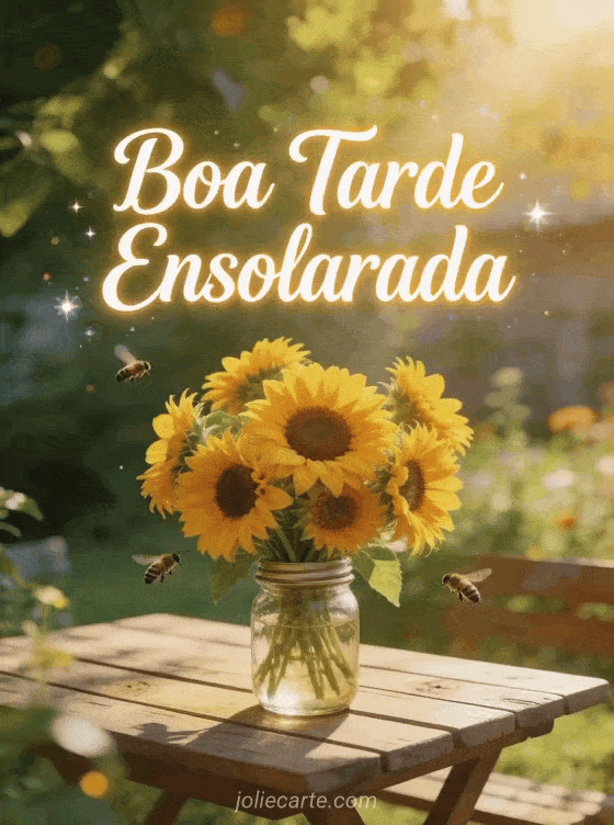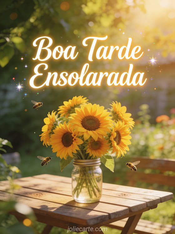 Compartilhe alegria de verão com este cartão de boa tarde ensolarada com um alegre buquê de girassóis num frasco com abelhas ao redor. Descubra também um cartão de boa tarde sol ou de imagens muito bonitas boa tarde.