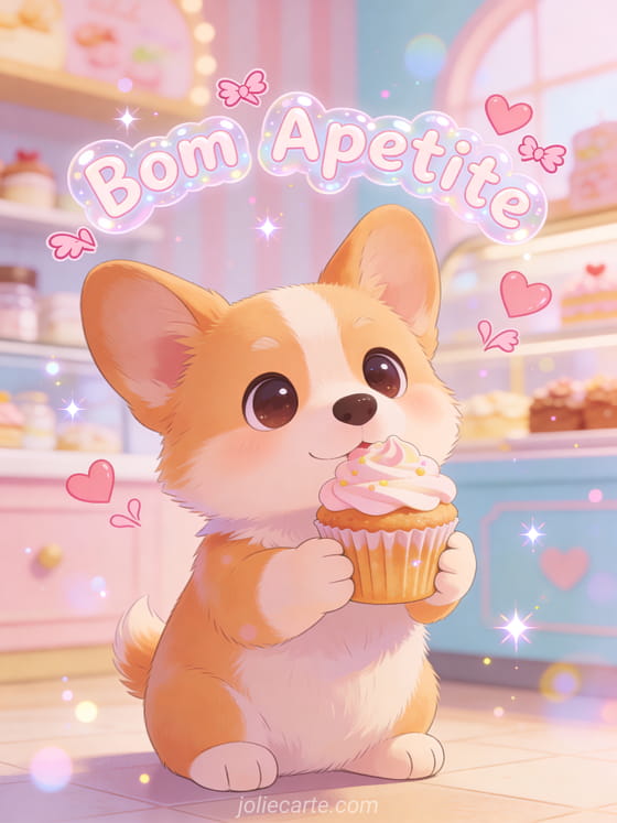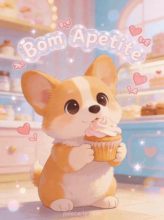 Gif bom apetite beijos um gif fofo de bom apetite com um adorável corgi segurando um cupcake