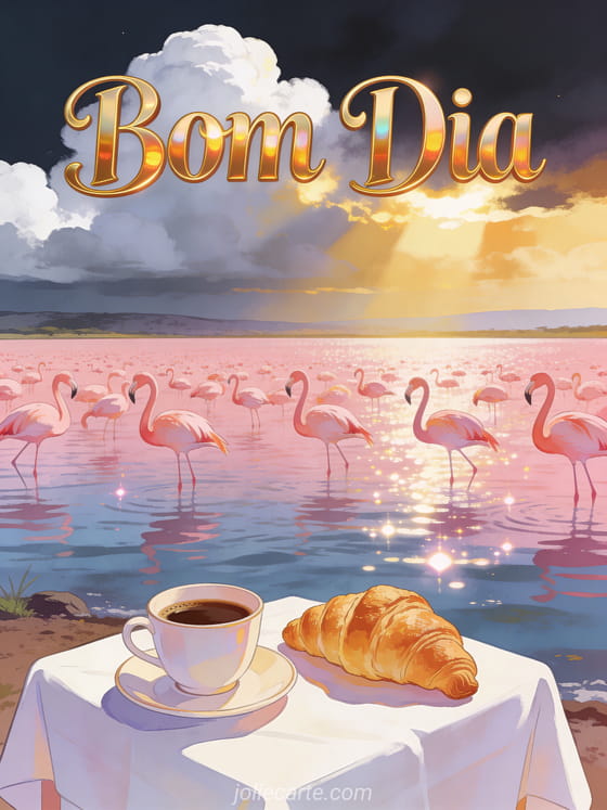 Comece o dia com este deslumbrante cartão com uma xícara de café e um croissant dourado junto ao lago Nakuru coberto de flamingos rosas, nuvens dramáticas com luz dourada e reflexos cintilantes na água. Descubra também um cartão de bom dia amigos com café ou um cartão de bom dia café com coração.