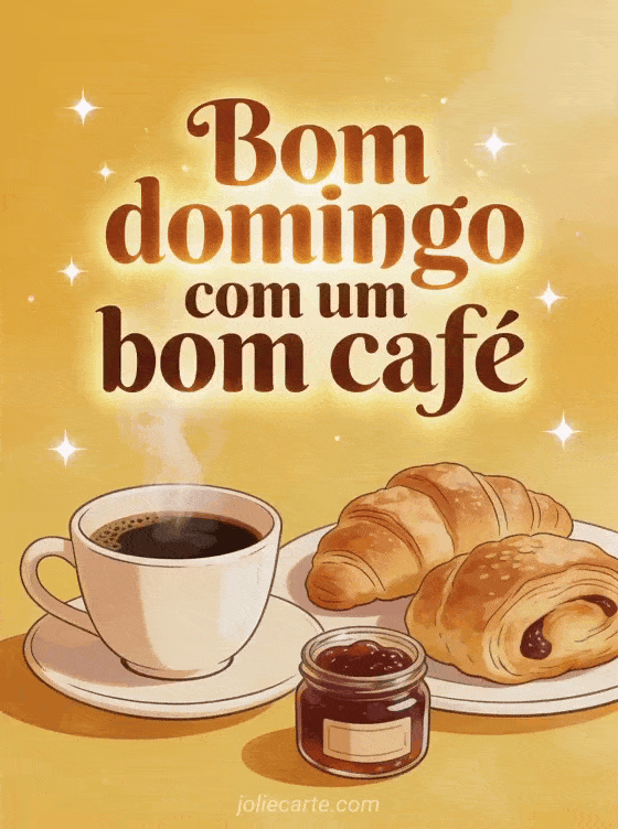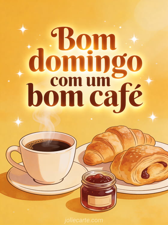 Envie uma saudação calorosa de bom domingo com letras castanhas, uma xícara de café fumegante, folhados, um potinho de geleia, tons dourados da manhã e detalhes brilhantes. Veja também este bom domingo gato humor, esta bom domingo minha amiga ou este feliz domingo gif humor.