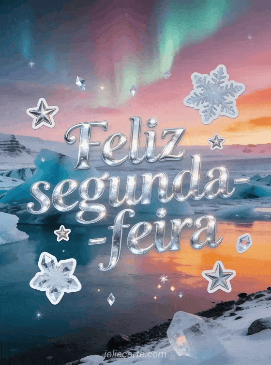 Envie um gif cintilante de feliz segunda-feira cintilante com letras prateadas geladas, estrelas congeladas e os icebergs azuis de Jokulsarlon sob um pôr do sol rosa e laranja. Compartilhe um desejo mágico de inverno e veja também bom dia feliz segunda-feira beijos imagem, feliz segunda-feira ensolarada gif ou segunda-feira beijos imagens.