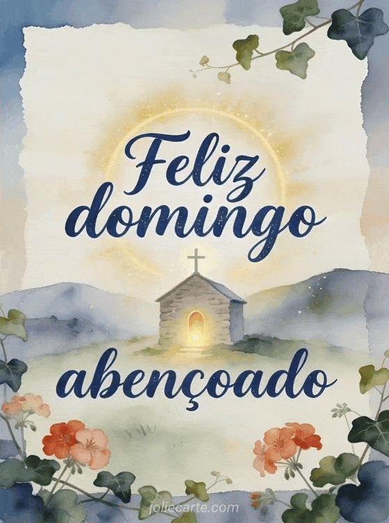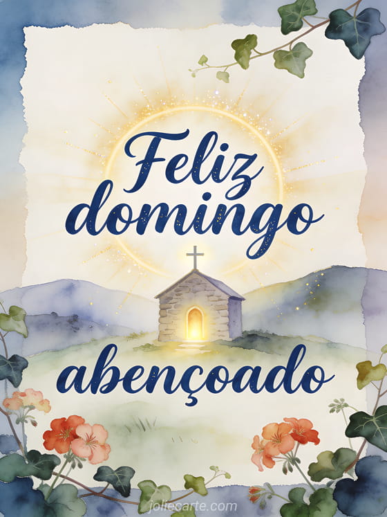 Envie uma bênção serena de domingo com caligrafia azul profunda, uma pequena capela de pedra, uma cruz luminosa, colinas tranquilas, gerânios e folhas de hera. Veja também cartões para desejar bom domingo, uma feliz domingo chuvoso imagem ou um feliz domingo beijos gif animado.