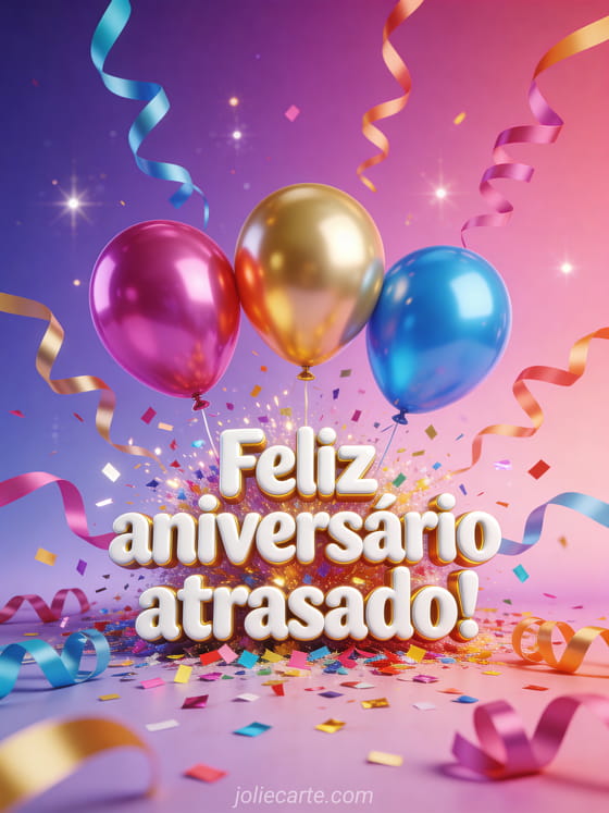 Este colorido cartão de aniversário atrasado traz uma explosão de confete multicolorido, serpentinas e três balões brilhantes em rosa fucsia, dourado e azul sobre um fundo degradê roxo e rosa. Perfeito para enviar quando você chega um pouco tarde. Descubra também um texto de feliz aniversário atrasado ou um cartão de aniversário com atraso para homem.
