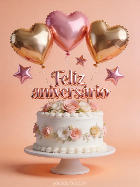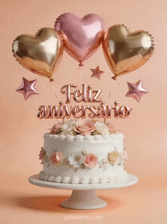 Surpreenda-a com este gif de aniversário com balões dourados e rosas em forma de coração e um bolo branco decorado com flores. Descubra também um gif aniversário mulher humor, um gif feliz aniversário mulher ou uma foto feliz aniversário mulher.