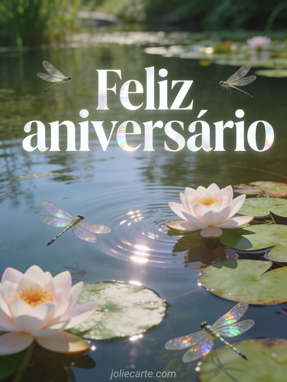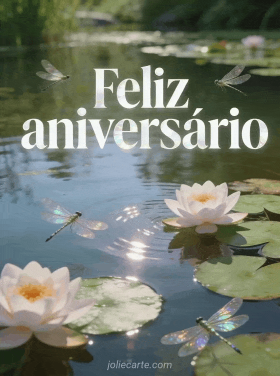 Ilumine o dia especial dela com este gif feliz aniversário com um tranquilo lago de nenúfares e libélulas iridescentes. Descubra também um cartão aniversário mulher flores ou uma imagem feliz aniversário mulher para fazê-la sorrir.
