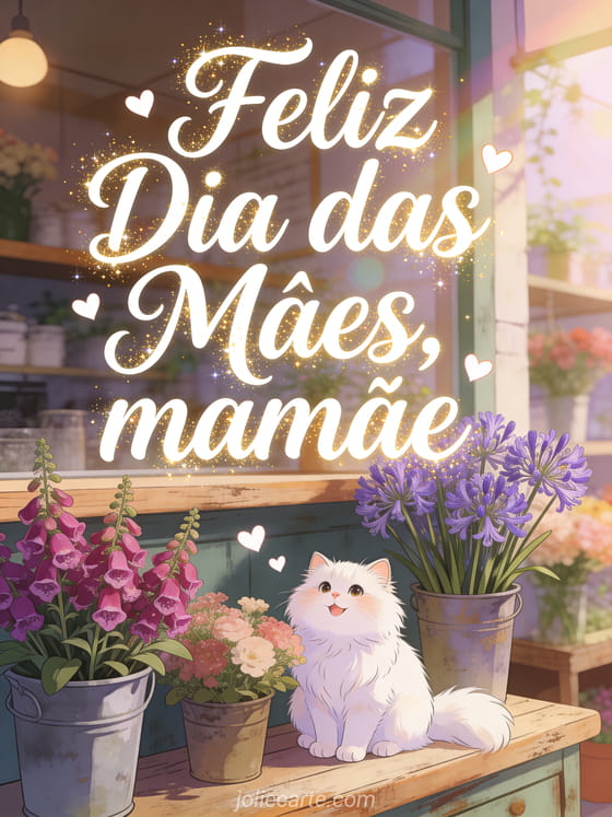Compartilhe este afetuoso gif feliz dia das mães como cartão. Uma floricultura aconchegante com fúcsias frescas e agapantos, um gato persa branco sentado feliz entre os arranjos com corações flutuantes. Descubra também um poema curto para o dia das mães ou um coração cartão dia das mães.