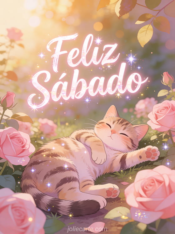 Envie uma doce saudação de feliz sábado com um adorável gato rajado se espreguiçando entre rosas cor-de-rosa em um aconchegante jardim. Uma forma encantadora de desejar um maravilhoso sábado. Descubra também um cartão bom dia sábado ou um cartão alegre de sábado.