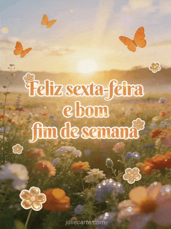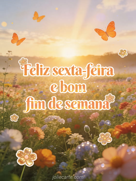 Comece o fim de semana com este encantador cartão de sexta-feira com um nascer do sol dourado sobre campos de flores silvestres com borboletas. Descubra também bom dia e feliz sexta-feira ou bela sexta-feira dia.
