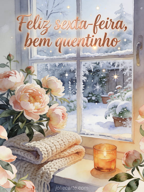 Compartilhe uma mensagem reconfortante de feliz sexta-feira com peônias junto a uma janela gelada, um cobertor de tricô dobrado e luz âmbar de vela em aquarela. Veja também feliz sexta-feira amigos imagem, feliz sexta-feira gifs ou imagem brilhante feliz sexta-feira.