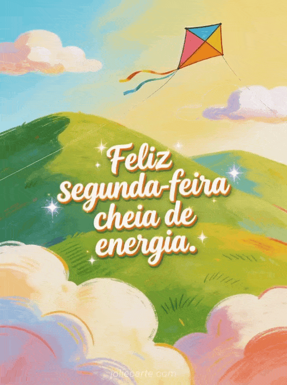Envie uma saudação cheia de energia de feliz segunda-feira com uma pipa voando sobre colinas verdes e nuvens brilhantes em cores vivas. Veja também boa semana e feliz segunda-feira gif, imagens para desejar uma feliz segunda-feira ou feliz segunda-feira e boa semana citação gif.