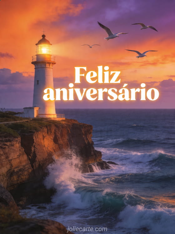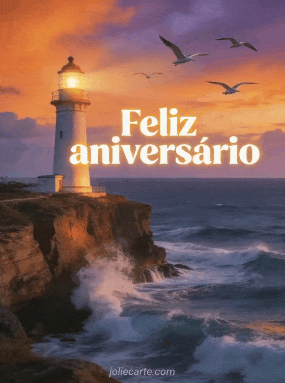 Compartilhe um poderoso feliz aniversário com este cartão fotorrealista com um farol sobre uma falésia ao pôr do sol, ondas quebrando e gaivotas no céu. Você também pode ver cartão aniversário animado grátis musical homem, animado feliz aniversário menino gif ou cartão aniversário animado 1 ano.
