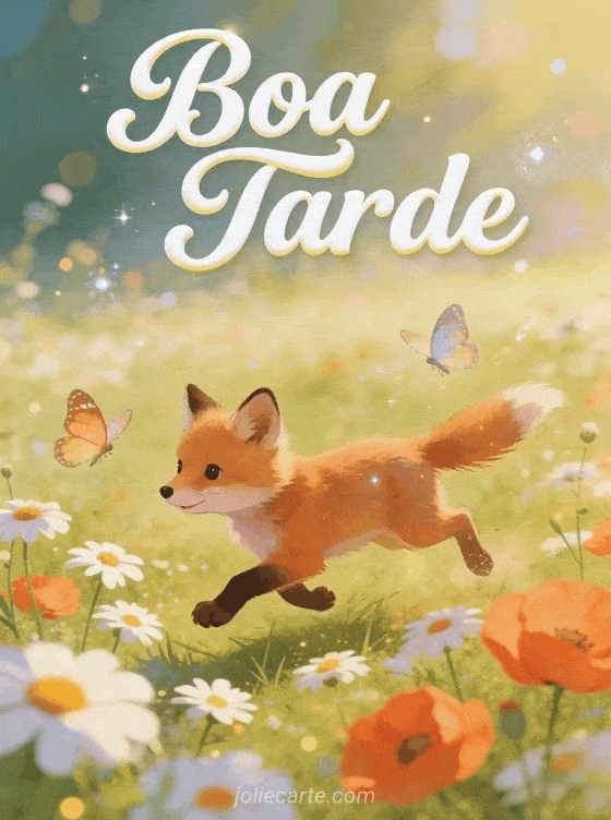 Um alegre e encantador cartão de boa tarde com um filhote de raposa brincalhão perseguindo borboletas em um prado cheio de margaridas e papoulas. Descubra também um gif boa tarde engraçado, uma imagem boa tarde gatinho ou um bom apetite e boa tarde.