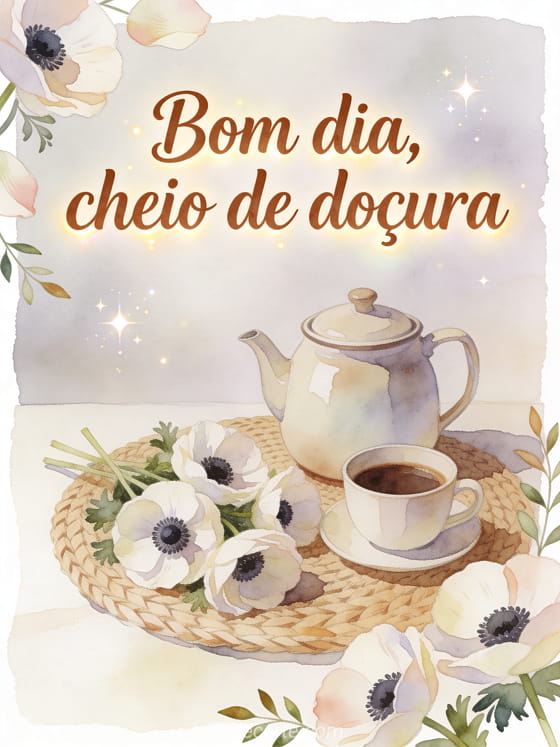 Compartilhe um início de dia tranquilo com este cartão em aquarela, com uma chaleira de cerâmica, uma xícara de café, anêmonas frescas, folhas finas e uma esteira trançada. Veja também bom dia café ternura, bom dia café citação ou gif brilhante de bom dia com café.