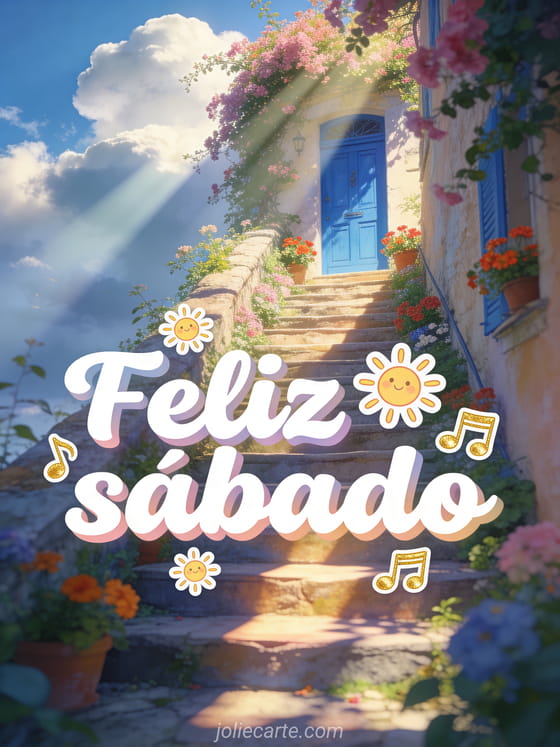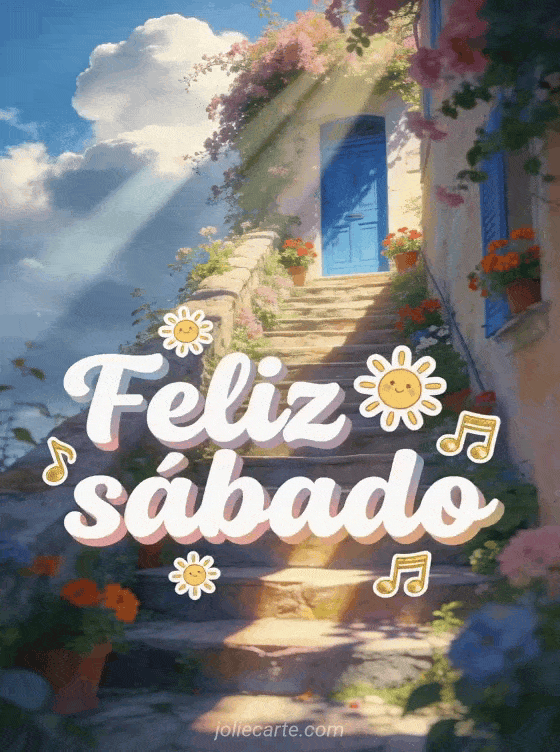 Envie gifs de feliz sábado para amigos com letras brancas alegres, pequenos sóis, notas musicais douradas e uma escadaria florida até uma porta azul mediterrânea. Compartilhe um desejo alegre de fim de semana e veja também amizade feliz sábado bom fim de semana, bom dia feliz sábado beijos ou paisagem feliz sábado paisagem.