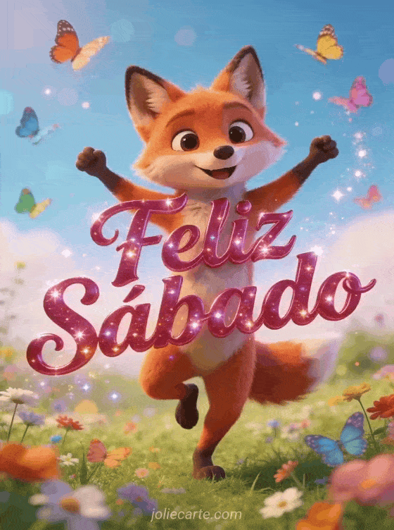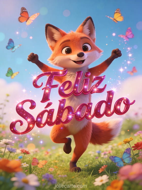 Compartilhe uma saudação divertida de feliz sábado com uma raposa fofa dançando alegremente em um campo de flores silvestres, cercada por borboletas coloridas e em estilo 3D de desenho animado. Veja também bom dia sábado imagens bonitas, uma imagem de feliz sábado muitos beijos ou bom dia feliz sábado.
