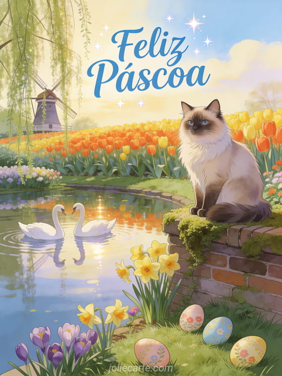 Celebre a Páscoa com este encantador cartão animado gratuito com um gato Birmanês sentado majestosamente em um muro coberto de musgo em Keukenhof com tulipas laranjas e amarelas, cisnes em um lago e ovos de Páscoa com motivos florais. Descubra também images gratuites joyeuses pâques carte virtuelle gratuite paques.