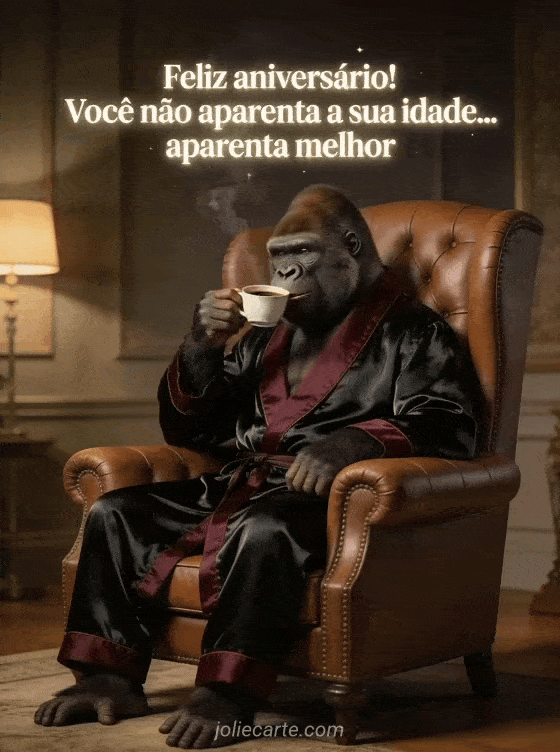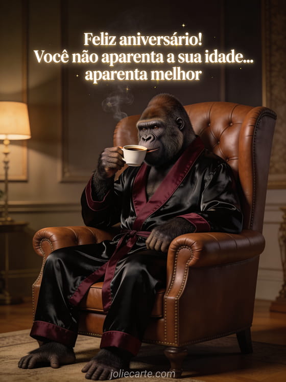 Compartilhe este cartão humorístico com um gorila elegante de robe de seda tomando café em uma poltrona clássica. Você também pode ver feliz aniversário engraçado, aniversário gato humor e vídeo aniversário hilariante.