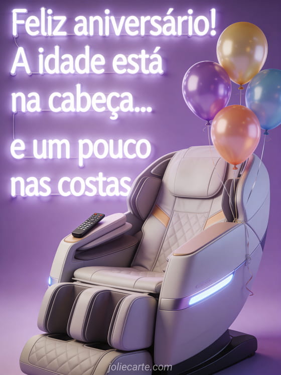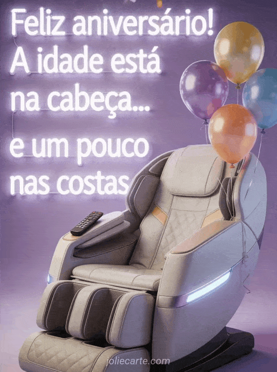 Envie este cartão animado de humor de feliz aniversário com uma poltrona de massagem de alta tecnologia e balões de aniversário. Descubra também uma imagem aniversário humor ou um humor aniversário.