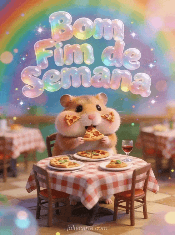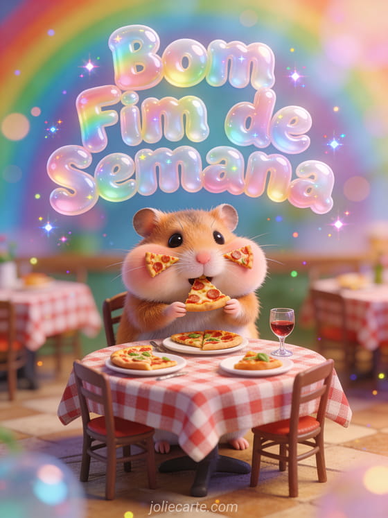 Envie um cartão de bom fim de semana com humor e arranque uma gargalhada. Um hamster engraçado enchendo as bochechas com uma fatia de pizza num restaurante italiano em miniatura é o desejo perfeito. Descubra também um cartão bom fim de semana gato humor ou uma imagem bom fim de semana.
