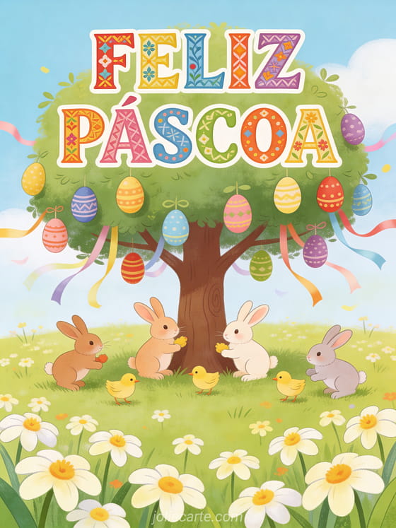 Envie alegres votos de Páscoa com este encantador cartão de arte popular. Descubra também uma imagem de Páscoa para descarregar e celebre as festas com alegria e carinho.