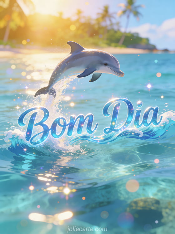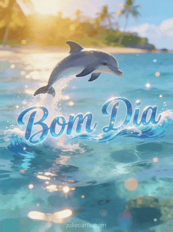 Compartilhe uma linda imagem animada de bom dia com um golfinho saltando da água cristalina ao amanhecer com uma ilha tropical ao fundo. Descubra também um cartão bom dia foto, um cartão desejo a vocês um bom dia ou um cartão de imagens bom dia.