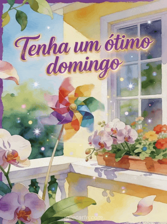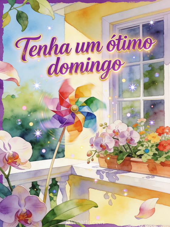 Celebre o domingo com um cartão luminoso em aquarela com um catavento de papel colorido, orquídeas e uma janela de jardim ensolarada. Você também pode enviar bom domingo amigos gif, compartilhar feliz domingo praia gif ou escolher feliz domingo a todos imagens.