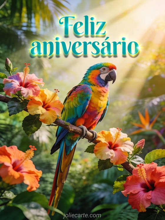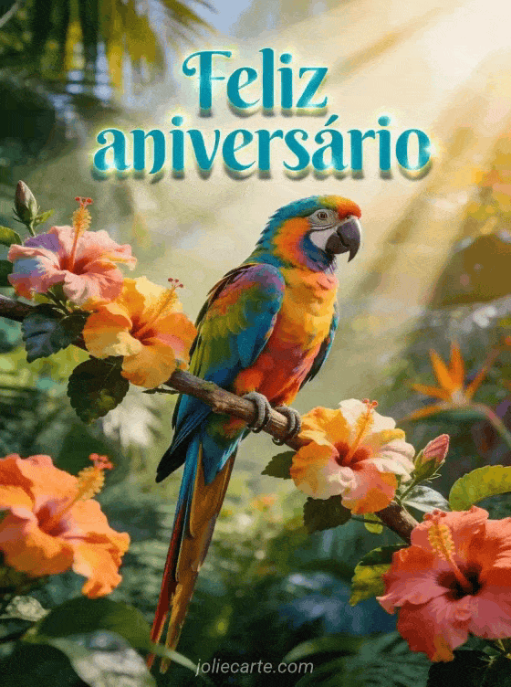 Comemore com uma imagem animada de feliz aniversário com uma arara multicolorida, hibiscos e clima de selva exuberante. Veja também aniversário animado, aniversário imagens animadas e cartão aniversário menino grátis animado.