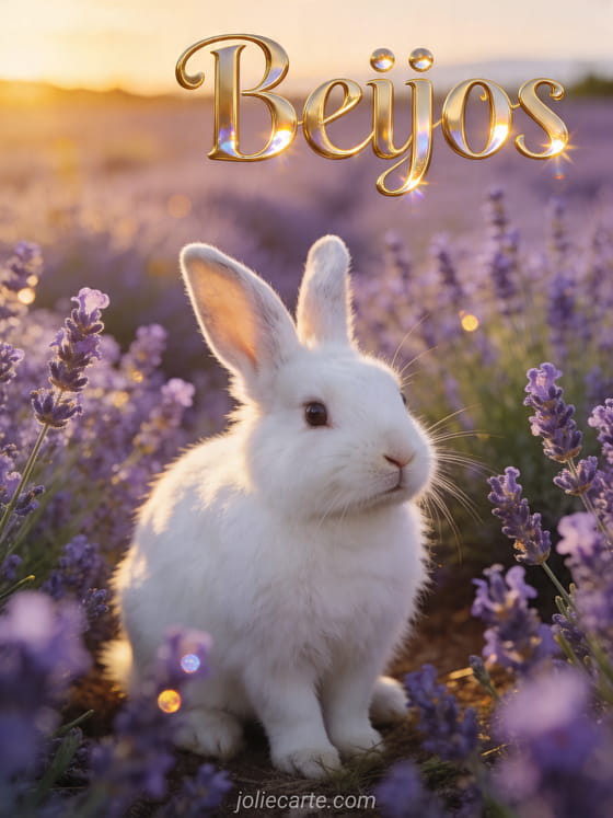 Compartilhe uma terna mensagem de beijos com este delicado cartão que mostra um coelho branco fofinho sentado em um campo de lavanda ao pôr do sol. Você também pode descobrir beijos gif, logos animados beijos ou beijinhos cura tudo.