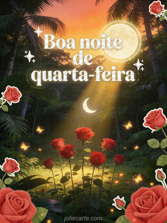 Compartilhe uma encantadora saudação de quarta-feira à noite com floresta exuberante, malvas-rosa floridas e uma lua crescente brilhante. Veja também gif boa quarta-feira beijos, flores boa quarta-feira imagens e imagem quarta-feira bom dia.
