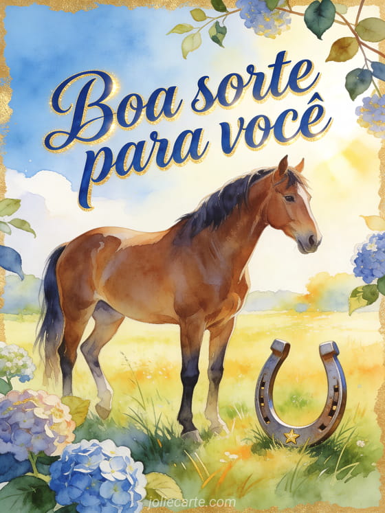 Envie boa sorte para você com caligrafia azul profundo, um cavalo castanho em uma campina luminosa, uma ferradura da sorte e hortênsias cruzando a borda. Veja também boa sorte incentivo gif, um cartão de boa sorte grátis ou cartão de boa sorte.