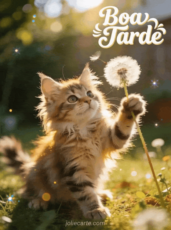 Compartilhe uma imagem de boa tarde com gatinho com este encantador cartão de gato Maine Coon e dente-de-leão. Descubra também bom apetite e boa tarde ou boa tarde imagens animadas.