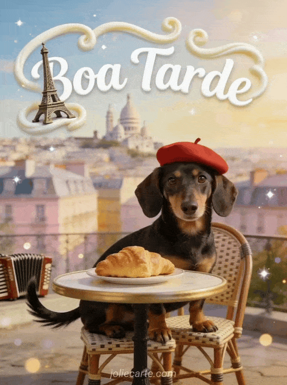 Compartilhe um sorriso com este divertido cartão de boa tarde com um cão bassê usando boina em um café parisiense. Descubra também um cartão de imagem boa tarde sol ou de gifs boa tarde grátis.