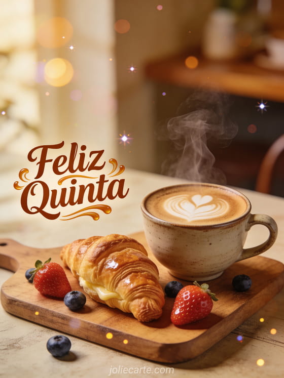 Compartilhe um aconchegante cumprimento de quinta-feira pela manhã com este caloroso cartão com um cappuccino com arte latte e um croissant dourado. Descubra também bom dia feliz quinta-feira ou imagem grátis feliz quinta-feira beijos para mais inspiração de quinta.