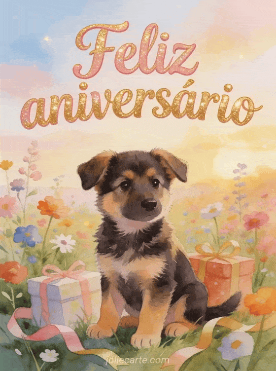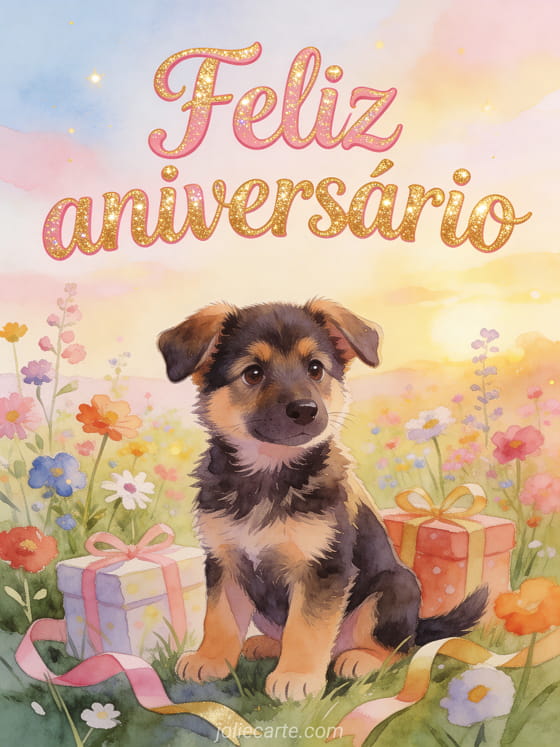 Compartilhe este encantador cartão de aniversário para criança com um fofo filhote de pastor alemão rodeado de flores silvestres e presentes. Descubra também uma tarjeta cartão aniversário festa criança ou uma tarjeta cartão virtual aniversário criança princesa.