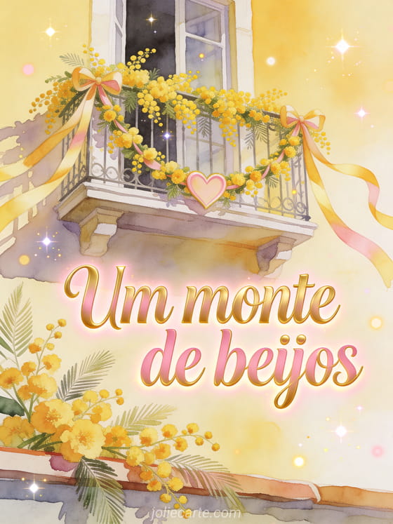 Compartilhe um monte de beijos com um cartão em aquarela luminoso, com letras douradas e rosadas, flores de mimosa e uma guirlanda de fita em forma de coração. Veja também um cartão de beijinhos, beijos meu coração gif ou beijos de amor casal.