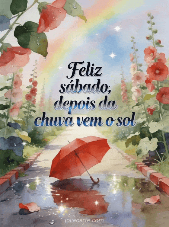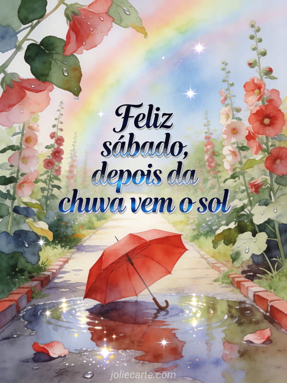 Compartilhe uma mensagem esperançosa de sábado com um cartão em aquarela com um caminho de jardim, um guarda-chuva vermelho, poças brilhantes, malvas-rosas e um suave arco-íris. Você também pode enviar uma imagem muito bonita feliz sábado, compartilhar feliz sábado beijos gifs ou escolher bom dia sábado imagem.