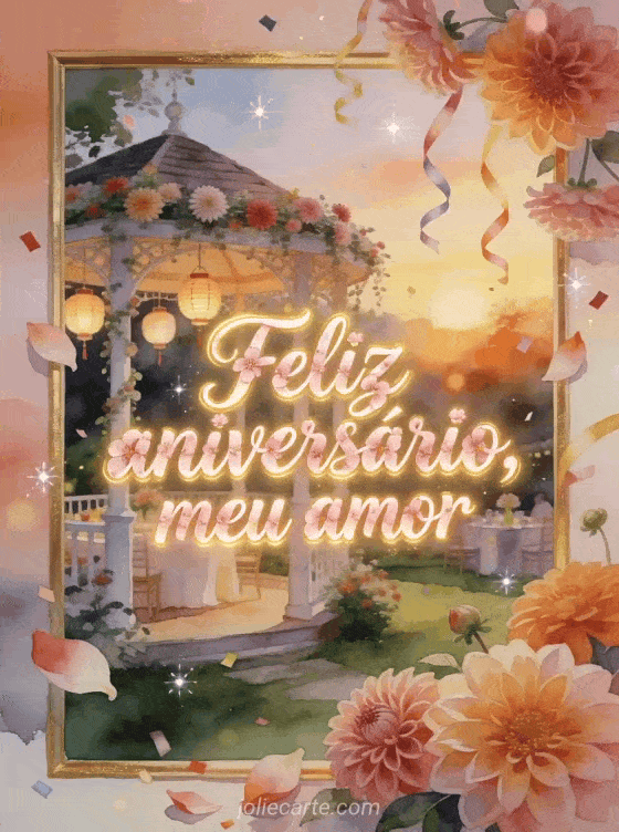 Celebre seu amor com um cartão de aniversário em aquarela que mostra um gazebo coberto de dálias, lanternas pendentes, fitas flutuantes e confetes brilhantes sob a luz quente do pôr do sol. Personalize e envie grátis esta saudação romântica. Veja também uma imagem de cartão de aniversário romântico, cartões de aniversário românticos ou um feliz aniversário meu amor gif.