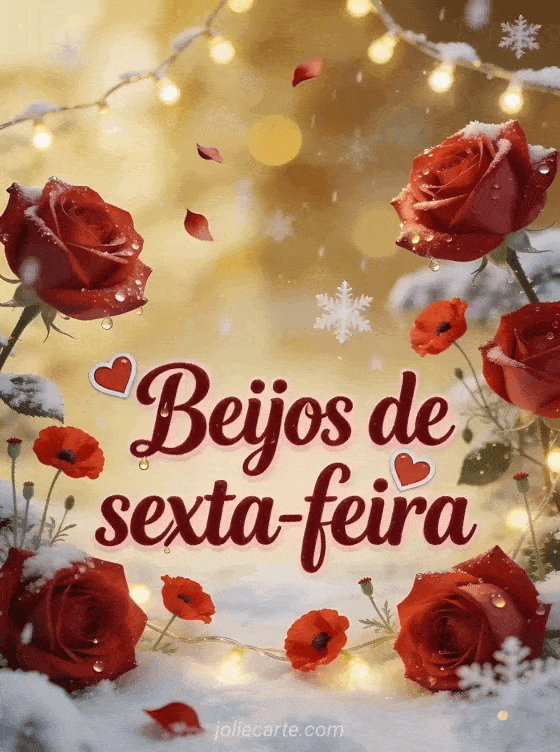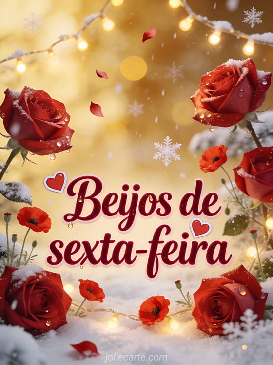 Compartilhe beijos de sexta-feira com rosas vermelhas, papoulas, pequenos corações, flocos de neve suaves e um brilho dourado caloroso. Veja também um cartão beijos de sexta-feira, um cyber cartão feliz sexta-feira ou um bom dia feliz sexta-feira de manhã.