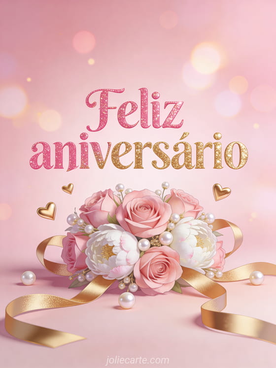 Comemore com um cartão de aniversário elegante com rosas cor-de-rosa, peônias brancas, pérolas, laços dourados e luz suave. Você também pode ver feliz aniversário na água, feliz aniversário gato imagem e aniversario cartao.