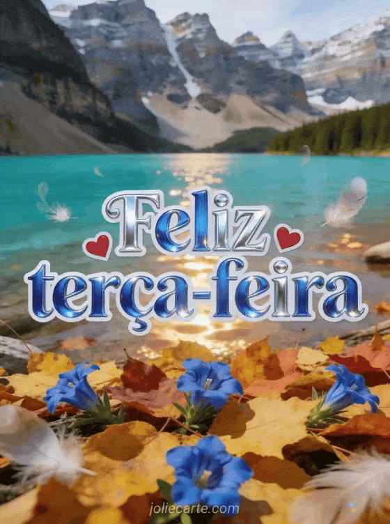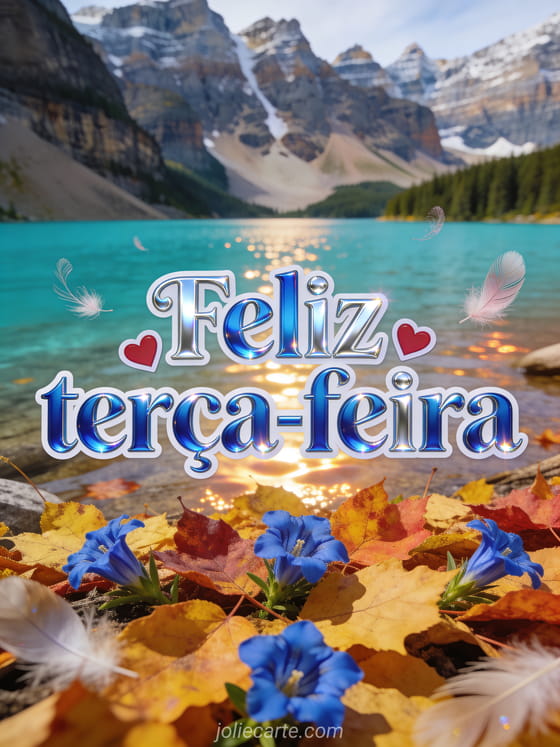 Envie uma imagem de feliz terça-feira beijos com letras azul genciana, corações vermelhos, plumas delicadas e o lago Moraine brilhando com luz quente de outono. Compartilhe um desejo romântico durante a semana e veja também feliz terça-feira humor imagem, feliz terça-feira cartão virtual ou bom dia feliz terça-feira imagem.