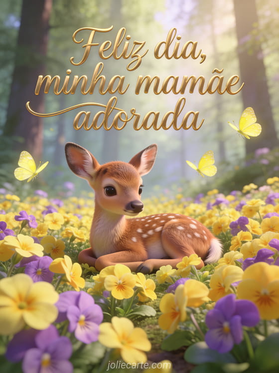 Surpreenda sua mamãe adorada com este cartão encantador com um filhote de veado entre prímulas amarelas e borboletas. Veja também um cartão dia das mães animado ou uma imagem dia das mães.