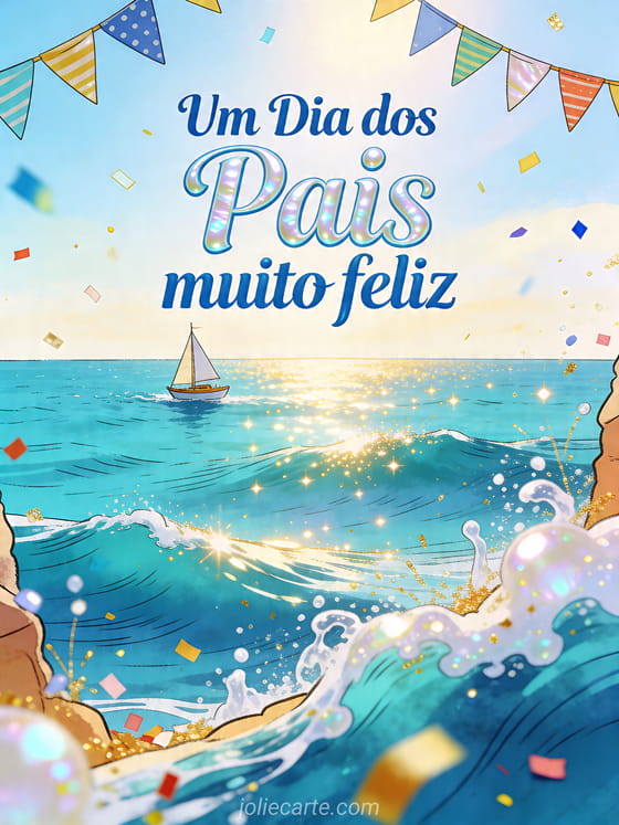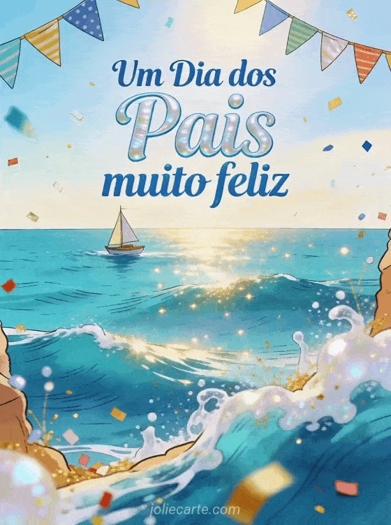 Compartilhe uma imagem Dia dos Pais ensolarada com um pequeno veleiro cruzando uma baía turquesa, bandeirinhas festivas, ondas brilhantes e confete alegre. Veja também um bom dia feliz dia dos pais, um cartão camisa de Dia dos Pais ou um cartão de Dia dos Pais.