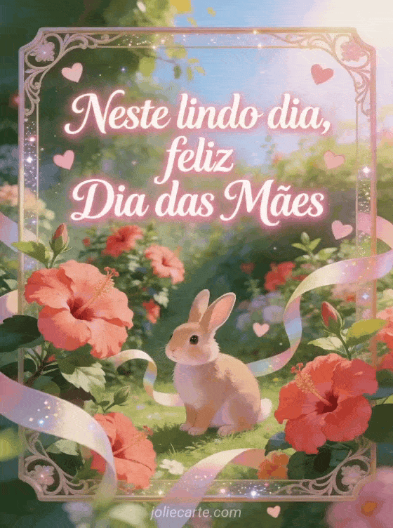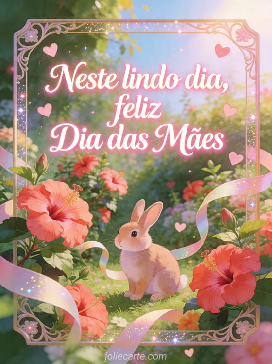 Compartilhe uma imagem do Dia das Mães com escrita marfim graciosa, brilho rosado e uma ilustração exuberante de jardim de hibisco. Um coelho curioso aparece entre grandes flores coral, fitas em movimento, glitter e corações suaves neste cartão alegre e terno. Veja também desenho para o Dia das Mães, poema sobre o Dia das Mães ou poema do Dia das Mães.